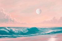 Een zachte zonsondergang kust de horizon terwijl zachte golven op het strand rollen. De grote, lichtgevende maan glinstert rustgevend over het water en mengt zich met pastelkleuren aan de hemel. Dit harmonieuze tafereel brengt rust in elke slaapkamer en creëert dromerige nachten geïnspireerd door de magie van de zee.