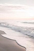 Zachte golven kussen het zandstrand, terwijl de lucht glinstert in delicate pastelkleuren. De kalme oceaan weerspiegelt de contouren van de wolken en een gevoel van vrede doordringt het tafereel. De overgang tussen water en land creëert een harmonieuze verbinding die uitnodigt om te dromen.