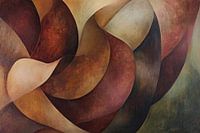 Een abstracte compositie van in elkaar grijpende, organische vormen in aardse kleuren zoals rood, oker en groen.