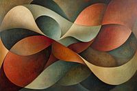 Een abstracte compositie van in elkaar grijpende, organische vormen in aardse kleuren zoals rood, oker en groen.