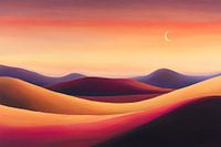 Een harmonieus landschap ontvouwt zich in zachte, warme kleurtonen, waar zachte heuvels rusten onder een delicate, groeiende maan. De vloeiende contouren geven de kamer een rustgevende sfeer. Ideaal voor de slaapkamer om een vredige nachtrust te bevorderen en dromen van weidse landschappen te wekken.