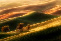 Zachte heuvels golven in verschillende tinten groen en baden in warm, gouden licht. Een betoverend spel van licht en schaduw omarmt de omlijnde landschappen, terwijl af en toe een silhouet van een boom voor een rustig accent zorgt. Het landschap straalt een vredige melodie uit die je uitnodigt om te dromen en de schoonheid van de natuur viert.