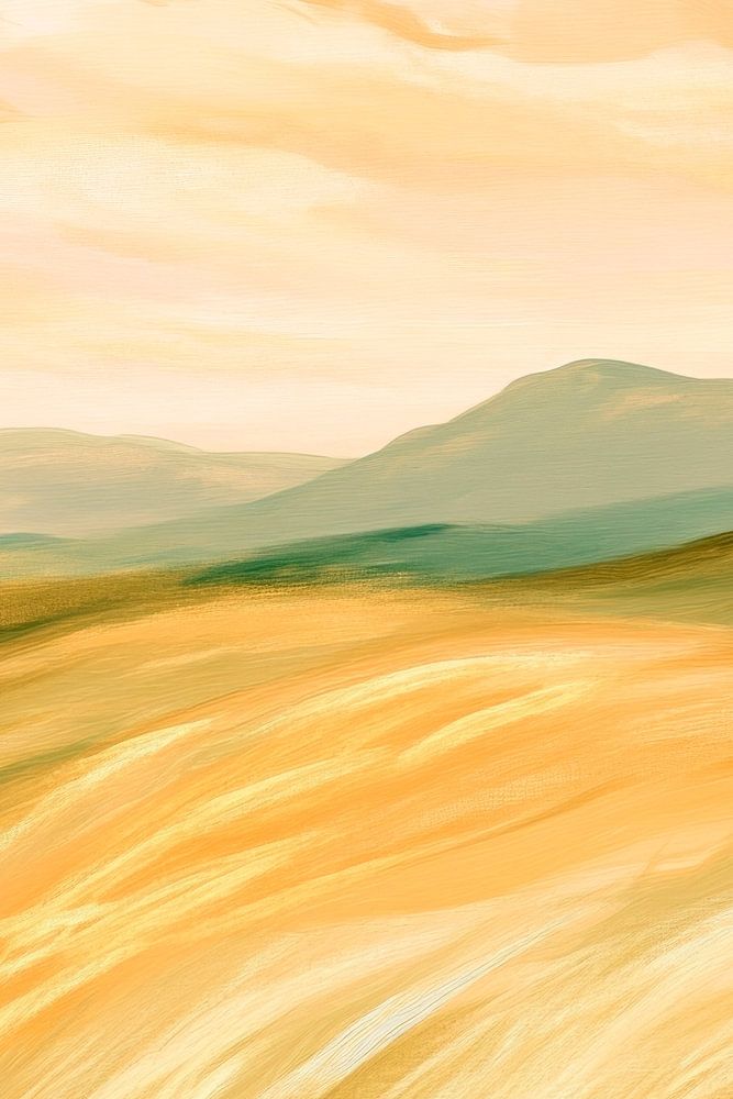 Zachte golven van gouden grassen dansen in het warme licht van de ondergaande zon, terwijl de glooiende heuvels op de achtergrond zorgen voor een vredige achtergrond. Dit vredige landschap straalt rust en ruimte uit, perfect voor de slaapkamer, waar het een rustgevende sfeer creëert, ideaal om te dromen en te ontspannen.