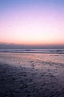 Op het stille strand weerspiegelt het laatste licht van de dag in het natte zand. Zachte pastelkleuren – roze, paars en lichtblauw – lopen langzaam in elkaar over aan de horizon, terwijl de zee kalm haar golven laat uitrollen. Schelpen en kleine structuren in het zand geven het beeld een subtiele textuur en brengen het rustige moment…