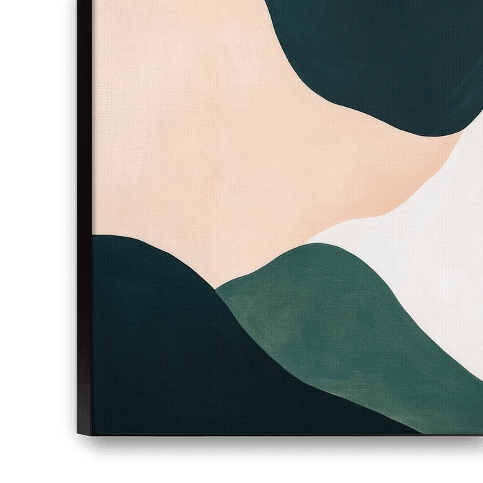 Een harmonieuze compositie van gebogen vormen ontvouwt zich in zachte aardetinten die in elkaar overvloeien. De zachte overgangen van crèmekleurig naar diepgroen geven het geheel een kalmerende vloeiendheid en creëren een sfeer van rust en harmonie. Een spel van licht en schaduw moet een dromerig landschap creëren.