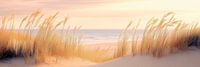 Zachte golven kussen de horizon, terwijl de duinen worden omarmd door het warme licht van de schemering. Fijne grassen wiegen in de wind en geven het landschap een dromerige lichtheid. De lucht schittert in zachte pastelkleuren en creëert een harmonieuze verbinding tussen aarde en zee - een onvergetelijk stukje natuur dat uitnodigt om te blijven hangen.