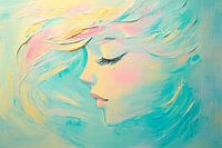 Zachte pasteltinten komen samen in een dromerige compositie die een gevoel van lichtheid en gratie uitstraalt. De delicate gelaatstrekken van een vrouwengezicht, omringd door zachte kleurverlopen, nodigen je uit om te dromen. Ideaal voor een slaapkamer of een creatieve ruimte om een rustgevende sfeer te creëren.