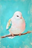 Een zachte vogel met zachte kleuren en bloemenaccenten brengt een gevoel van rust en lichtheid in elke kamer. De heldere turquoise achtergrond versterkt de vrolijke uitstraling en maakt de foto een perfecte blikvanger voor de keuken of woonkamer. Voeg een vleugje natuur en inspiratie toe aan je muren.