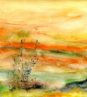 Het schilderen, Zacht, Licht, Bolvormig, Eigentijds, Modern, Decoratief, Abstract, Impressie, Stilte, Landschap, Aquarel, Weide, Impressionisme, Natuur, Zacht, Landschap, Atmosferisch, Warm, Lucht, Geel, Oranje, Grafisch, Illustratie, Waterverf
