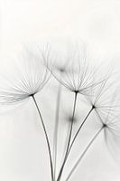 Een betoverend, minimalistisch zwart-wit beeld van paardenbloempluis dat met uiterste precisie is vastgelegd. De delicate zaadjes vormen een elegant lijnenspel tegen een zachte, lichte achtergrond, waarbij de fragiele structuren een bijna grafische compositie creëren die zowel sereen als dynamisch aanvoelt.