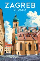 De toren van een historische kerk staat majestueus in een helderblauwe lucht, terwijl de kleurrijke dakpannen mysterieuze verhalen fluisteren. De charmante, pastelkleurige gebouwen van de oude stad nodigen je uit om ze te ontdekken en het pittoreske plein vertelt over levendige ontmoetingen. Zagreb ontvouwt zijn speciale magie in elke hoek en op elke wolk.