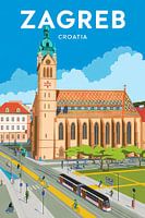 Een harmonieuze mix van historische architectuur en een bruisend stadsleven schittert in rijke kleuren. De opvallende kerktoren rijst trots op in de blauwe lucht, terwijl de trams rustig door het levendige landschap rijden. De charme en culturele diversiteit van Zagreb trekken de aandacht, omgeven door zachte wolken en de warme sfeer van een Europese stad.
