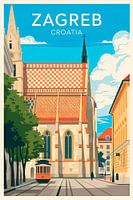 Er ontvouwt zich een schilderachtig stadslandschap, waarin het opvallende dak met zijn kleurrijke dakpannen kunstig schittert. De slanke torens rijzen trots naar de hemel, terwijl de nostalgische tram een charmante sfeer creëert. Omlijst door historische gebouwen en een helderblauwe lucht geeft deze foto de levendige flair van Zagreb weer. Een oproep om te ontdekken en te blijven hangen!