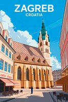 De majestueuze kerk met zijn opvallende toren schittert in het zonlicht tegen de charmante achtergrond van Zagreb. Kleurrijke gebouwen omlijsten het plein terwijl wolken zachtjes door de lucht drijven. Een eenzame wandelaar geniet van de vredige sfeer die geschiedenis en moderne levensstijl harmonieus combineert. Een plek vol karakter en cultuur nodigt je uit om het te ontdekken!