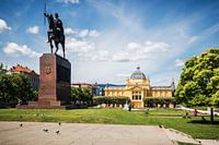 Een impressie van de Kroatische hoofdstad Zagreb: het Tomislavplein (Trg Kralja Tomislava) met het ruitermonument voor koning Tomislav en het kunstpaviljoen.