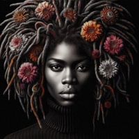 Portret van een prachtige donkere vrouw, bloemen in het haar, haar blik indringend.