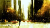 Een impressionistisch schilderij toont een zakenman die door een drukke stadsstraat fietst. Omringd door auto's en felgele taxi's geeft het tafereel de dynamiek van het moderne stadsleven weer. De losse penseelstreken geven het kunstwerk een levendige en stijlvolle esthetiek.