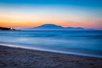 Op deze foto zien we een prachtige pastelkleurige zonsondergang aan het strand van Zakynthos (Grieks eiland). De zon zakt langzaam onder de horizon, terwijl de lucht in prachtige pastelkleuren is gekleurd. De berg op de achtergrond geeft het geheel een adembenemende uitstraling. Het is duidelijk te zien dat deze foto op een warme, zwoele zomerdag is gemaakt. De golven van de zee kabbelen zachtjes op het strand en het lijkt bijna alsof de tijd stil staat op dit prachtige plekje op aarde.