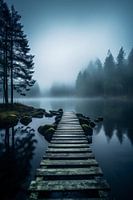 Zalige avond in het mistige meer