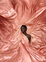 Een fascinerend kunstwerk dat rust en verfijning uitstraalt. Een vrouw rust uit in een zee van vloeiende, zalmkleurige zijde, waarvan de zachte glans het licht subtiel weerkaatst. De zachte plooien van de stof lijken op een levendige golf van warmte en lichtheid - een symbool van vrede, vrouwelijkheid en kracht.