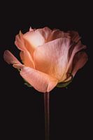 De zalmroze roos straalt met haar gelaagde bloemblaadjes een gevoel van zachtheid en diepte uit. De tint zit precies tussen roze en perzik in, subtiel en elegant. Het licht speelt met de structuur van de bloem en benadrukt haar natuurlijke vorm en kwetsbare kracht.