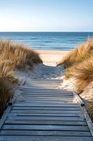 Dit rustgevende kunstwerk onthult een houten pad dat zich een weg baant door de zandduinen, rechtstreeks naar de kalme zee die in de verte ligt.