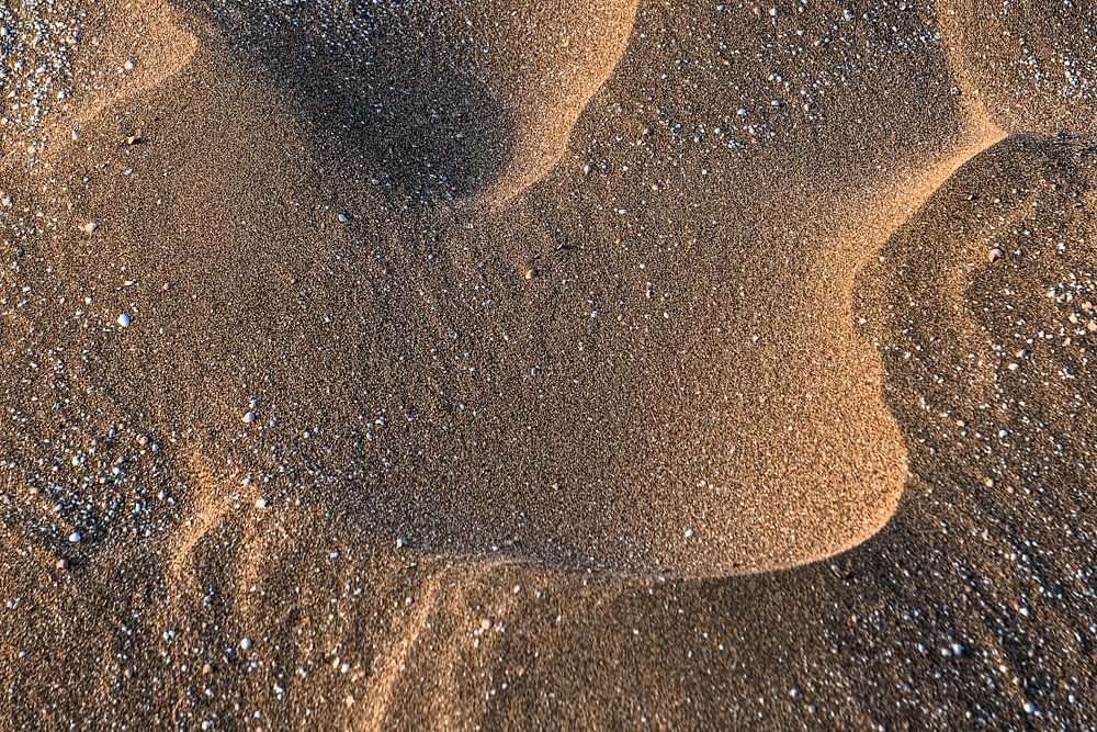 Zand structuren veroorzaakt door de wind en eb en vloed, op het strand met het strijklicht van de late zon wat een zachte oranje gloed veroorzaakt
