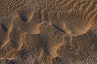 Zand structuren veroorzaakt door de wind en eb en vloed, op het strand met het strijklicht van de late zon wat een zachte oranje gloed veroorzaakt