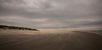 Een bewolkte winderige dag op het Nederlandse Waddeneiland Ameland. Zand stuift over het strand bij Hollum. De lucht kleurt roze en oranje aan de horizon.