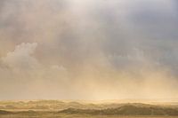 Zandduinen bij het Noordzeestrand op Texel met zonnestralen op het strand op de achtergrond. De lucht is gevuld met stormwolken maar ook zonneschijn die door de wolken heen op het lege strand en de duinen schijnt.