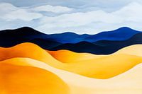 Golven van zachte, gouden duinen ontmoeten indrukwekkende, diepblauwe bergen onder een uitgestrekte hemel. Deze harmonieuze kleurencombinatie creëert een rustgevende sfeer en nodigt uit om te ontspannen. Ideaal voor een woonkamer, het brengt een gevoel van ruimte en vrijheid in de kamer, perfect om te dromen en te treuzelen.