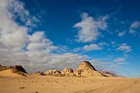 Zandduinen en rotsen in de Wadi Rum woestijn - tegen een blauwe wolkenlucht - in Zuid Jordanië - Midden Oosten