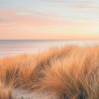 Zachte golven strelen de kust, terwijl gouden grassprietjes zachtjes dansen in de wind. De magische schemering baadt de horizon in delicate pastelkleuren en verandert het landschap in een dromerig schilderij. Een plek waar rust en schoonheid harmonieus samensmelten.