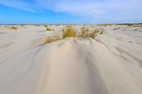 Kleine zandduinen met duingras of helmgras op het strand van het Waddeneiland Schiermonnikoog tijdens een mooie lente dag. In het zand worden lijnen en patronen gevormd door de wind die tussen de duinen door blaast.