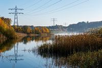 Zanderij Maarn, meer met hoogspanningsmasten spiegelend in het water. Ochtendmist op de achtergrond en de omging in herfstkleuren. Utrecht, Nederland.