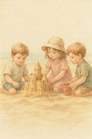 Kinderen die op het strand spelen en een zandkasteel bouwen. De kinderen zijn gekleed in strandkleding, met kleuren die overvloeien in het zandstrand. De kinderen gaan op in hun spel en genieten volop. Zonnestralen breken zacht door de sluier van wolken en zetten het tafereel in warm, diffuus licht. Op de achtergrond glinstert de zee,…