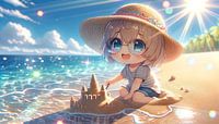 Als een scène uit een zomerse manga zie je op deze foto een kind dat een zandkasteel bouwt. Met een strooien hoed op zijn hoofd en een schittering in zijn ogen die het heldere blauw van de oceaan weerspiegelt, doet de afbeelding denken aan een anime-serie waarin plezier en spel centraal staan. De twinkelende lichtjes en het glinsterende…