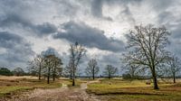 Een zandpad op Aekeringezand met aan weerskanten bomen. De lucht is dreigend.