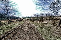 Eindeloos fantaseren waar het pad heen gaat, staat er een huisje , net om de hoek misschien? waar kom ik vandaan, wat zal er achter mij zijn. de dorre takken de grafisch weer gegeven bomen samen een landschap wat in een sprookje past of in een romantisch verhaal misschien?