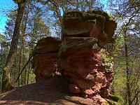 Karakteristieke roodachtig glinsterende zandsteenrots in het Pfälzer Wald bij Annweiler am Trifels, Rheinland-Pfalz, Duitsland op een zonnige dag in het voorjaar, omgeven door bomen.