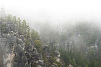 De foto is genomen op een regenachtige lentedag. Toen de regen even ophield, kwam er mist opzetten in het rotscircus van het Basteigebied bij Rathen/Saksen. Het landschap kreeg een mystieke aanblik.