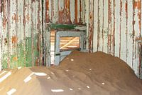 Spel van licht en schaduw in het woestijnzand. Door stormen is deze kamer in een vervallen en verlaten ziekenhuis bedolven onder het zand uit de omringende woestijn. Vintage spookstad (Ghost town) Kolmanskop (Kolmannskuppe), Lüderitz, Namibië, Afrika. Het gebouw staat sinds de vijftiger jaren (50s, 1950s) leeg toen de diamantmijnen gesloten werden. Urbex, verval, verwaarloosd, degeneratie.