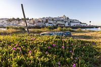 Zandstrand in de ochtend met uitzicht op de historische oude stad Ferragudo, Portimão, Algarve, Portugal. Ik heb deze plek speciaal gekozen om deze foto's te maken.
