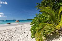 Zandstrand op het Seychellen eiland Praslin met palmbomen, granieten rotsen, turquoise water en zeiljachten op de achtergrond