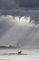Zandvoort aan zee gezien vanaf de pier van IJmuiden op een dag dat na een hele dag regen langzaam de bewolking open breekt en de zonnestralen doorkomen.