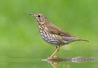 Zanglijster staand in groen gekleurd water in een bos in Hongarije.