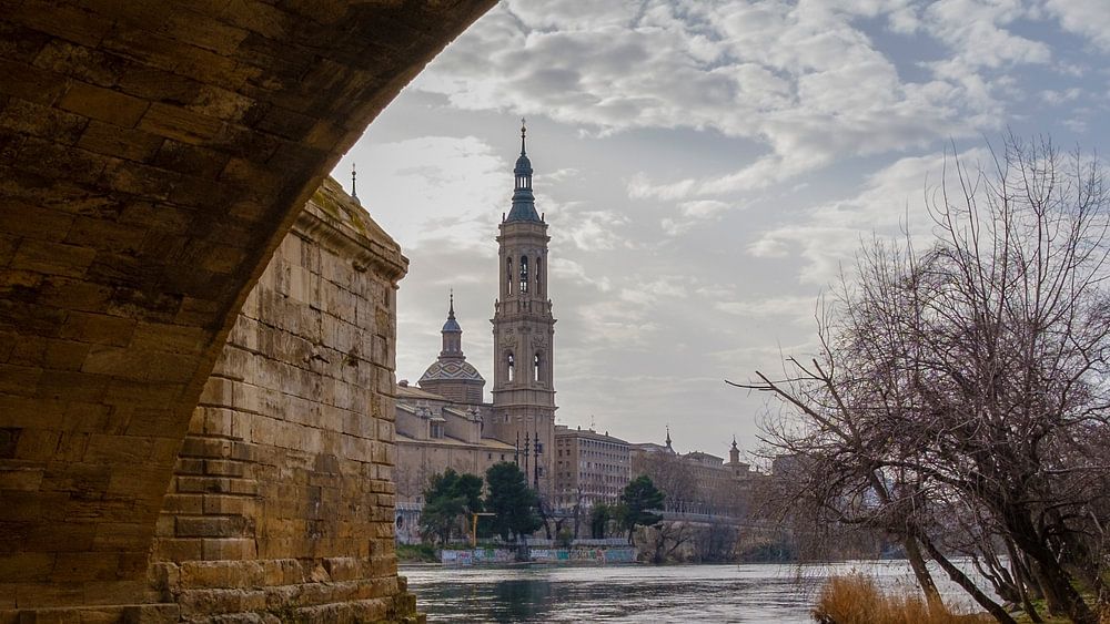 Doorkijkje onder de - Puente de Piedra - over de Ebro rivier. Op de achtergrond de kathedraal - El Pilar.
