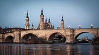 Opname van de brug - Puente de Piedra - over de Ebro rivier in Zaragoza. Op de achtergrond - El Pilar - kathedraal.