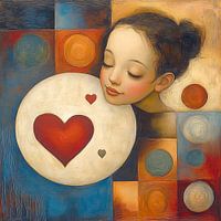 Het vrolijke gezicht van een jonge vrouw staat tegen een levendige achtergrond van geometrische vormen. De grote witte cirkel met hartjes op de voorgrond geeft het beeld een vleugje speelsheid en vestigt de aandacht op de thema's liefde en dromen. Het warme kleurenpalet straalt rust en introspectie uit.