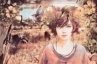 Deze dame houdt er zeker van om op het platteland te wonen. Ze is ooit begonnen in de stad. Leuk natuurlijk en gezellig, en alles bij de hand, maar wel druk en vol. Dat heeft ze dus achter zich gelaten. Ze is verhuisd naar een mooi huis op het platteland. Midden tussen de weilanden, de bossen en de landerijen. Haar huis staat aan de rand van een dorp en is omringd door weilanden. In die weilanden lopen ganzen met jongen. Dat is wat ze graag wilden ganzen houden en dat is gelukt. De ganzen lopen in het weiland achter haar. Er vliegt een vogel en ze wordt omzoomd door bloemen en zelfs door korenaren. Hoeveel platteland wil je hebben. Zij zelf heeft zelfs bladeren in haar haar zitten en is gewoon één met haar platteland. De kleuren die hier gebruikt zijn zijn zacht en pastel. Roze, Lichtblauw, beige, bruin en bordeaux zijn de kleuren van dit kleurenpalet.